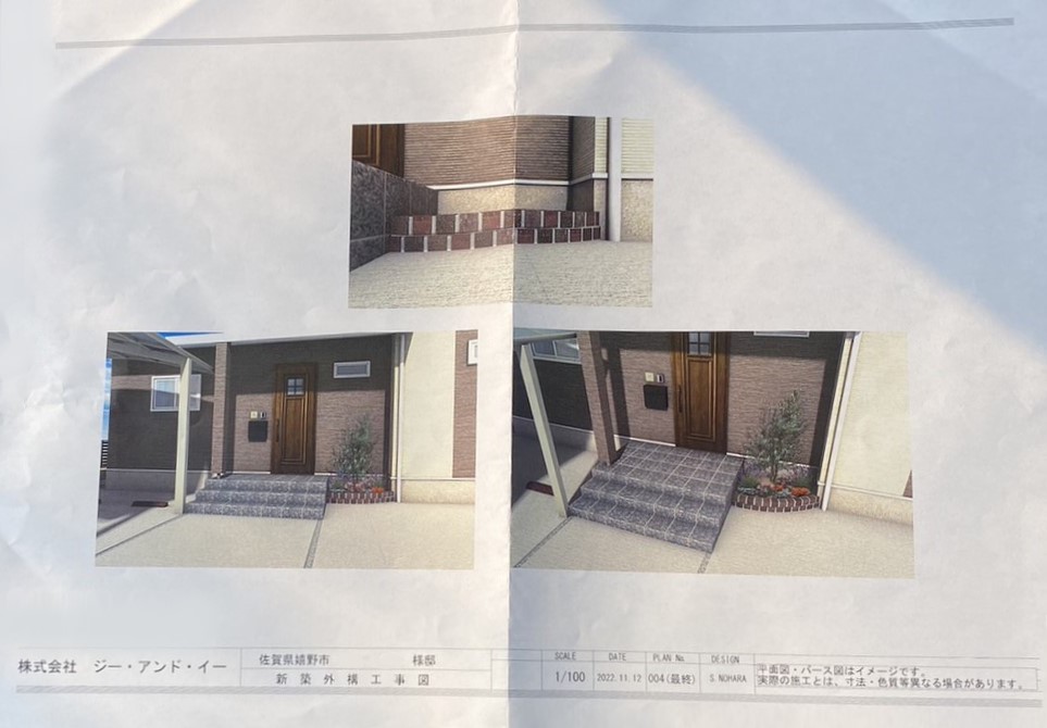 玄関横のプリコロ(レンガの素材名)で作った花壇が設計図と違うのは、外観に合わせて工夫した為です。