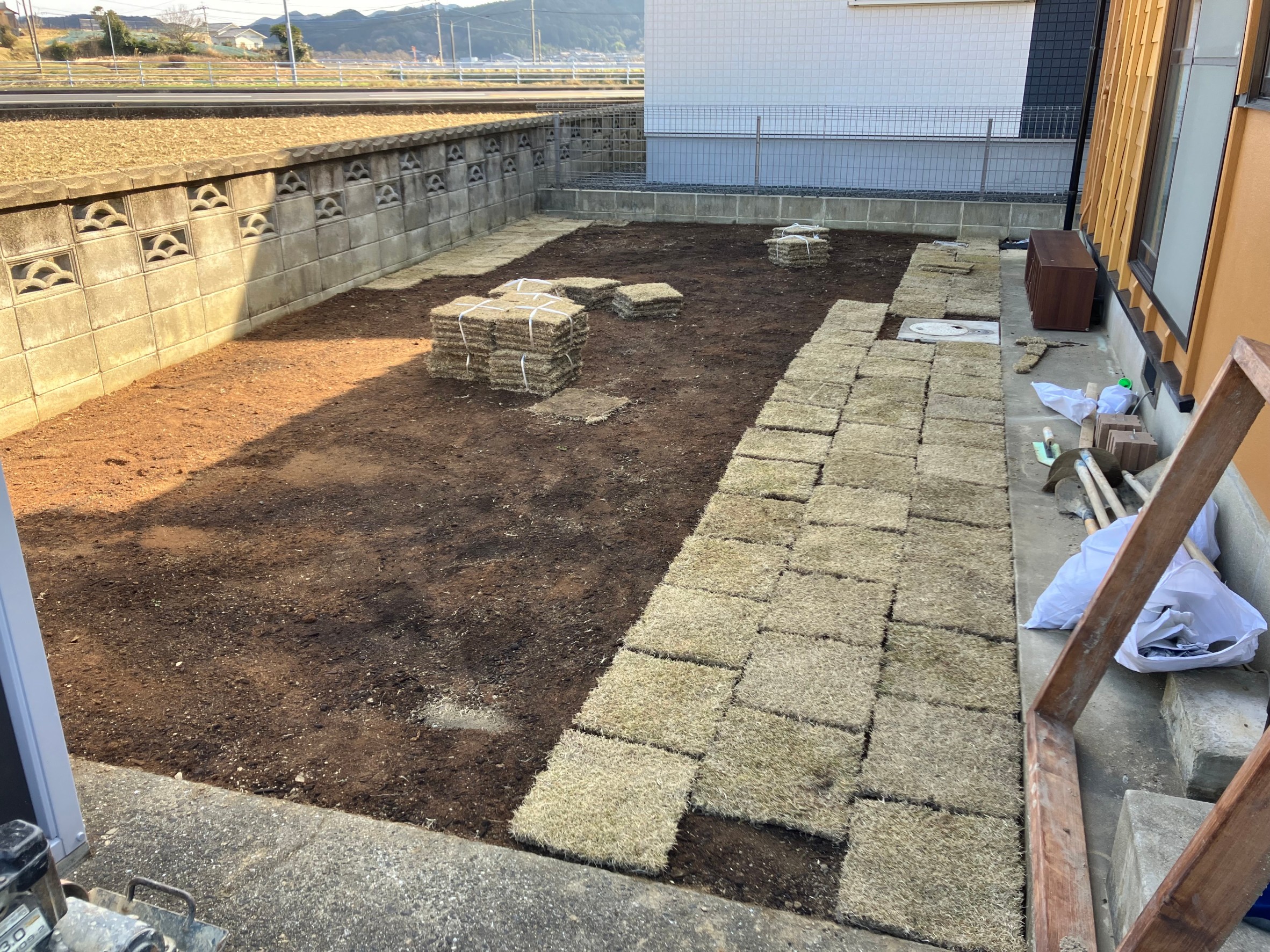先日のお客様先で、天然芝を黒い肥料が敷いた上にはりました。